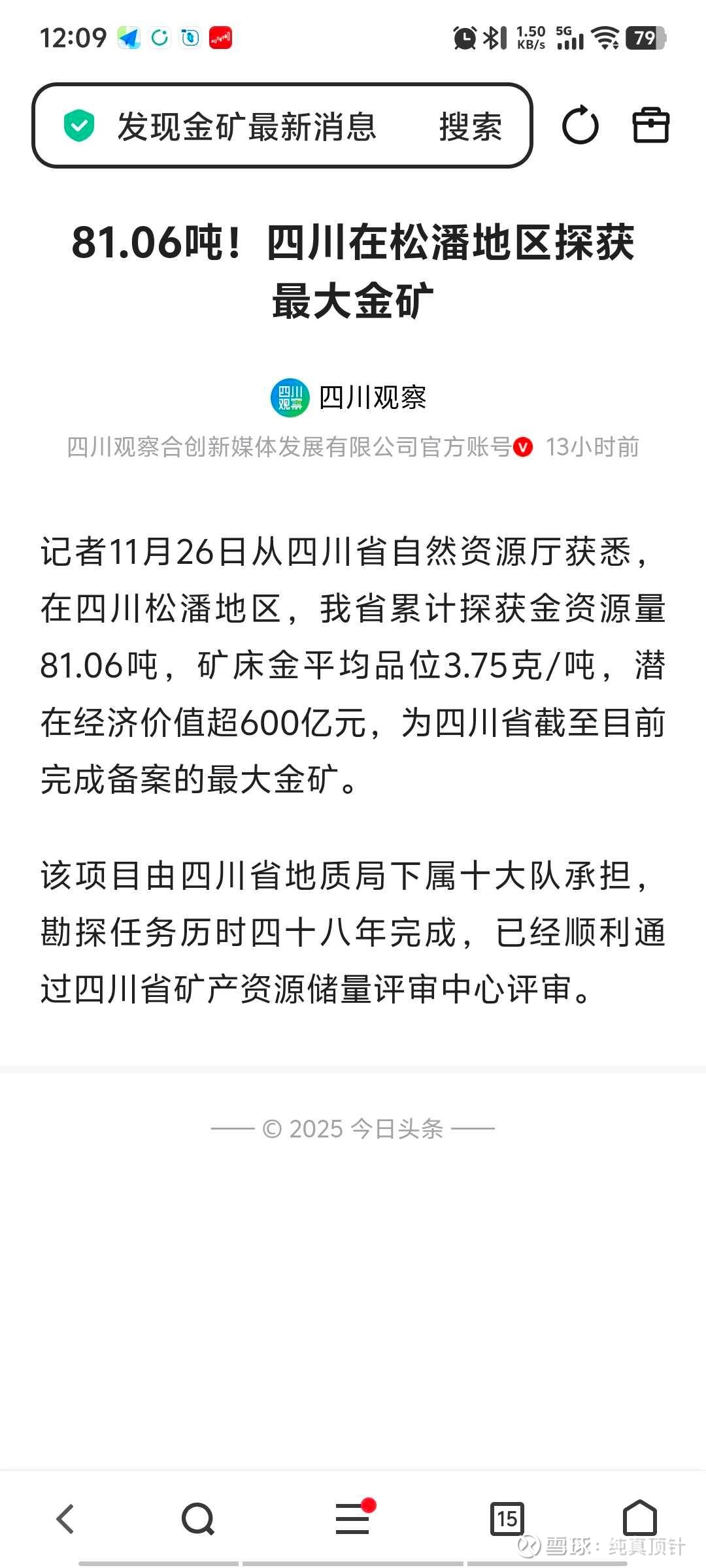 据央视新闻,11月26日,记者从四川省自然资源厅获悉,“四川省松潘县东北寨金矿床勘探”项...