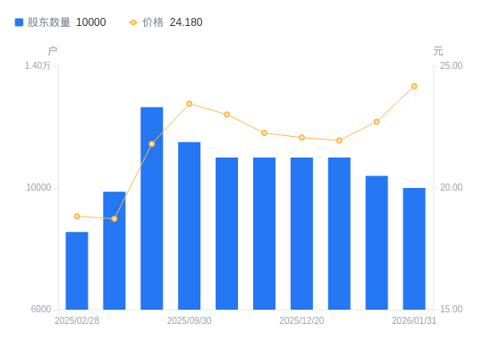 近一年(2025年2月28日至2026年1月31日),海森药业A股股东户数从8552户,增加至1万户,增幅16.93%,区间股价上涨28.31%。