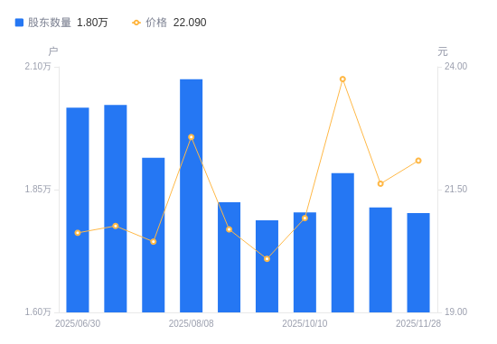 近一年(2024年12月10日至2025年11月28日),腾达科技A股股东户数从2.35万户,减低至1.8万户,降幅23.33%,区间股价下跌11.96%。
