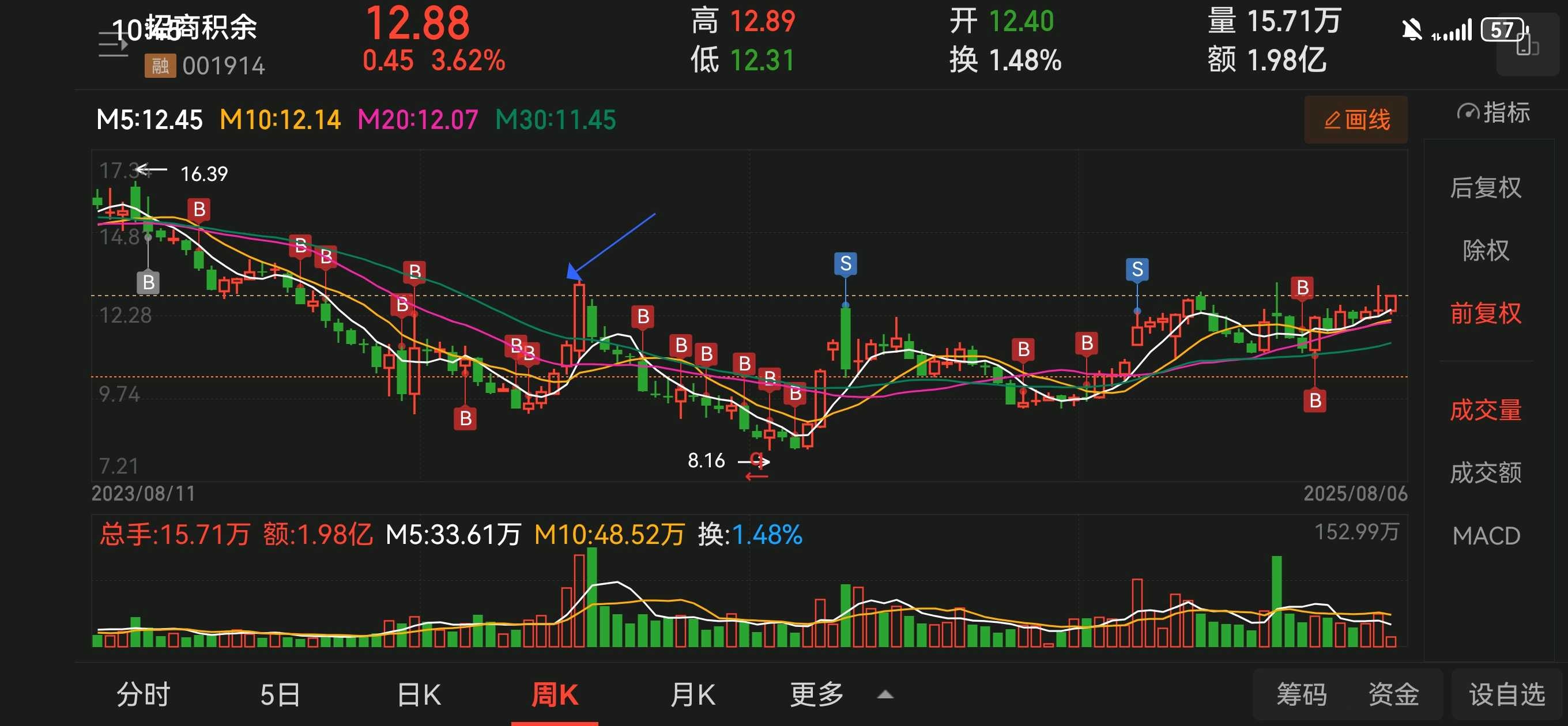 ,初始建仓价15.37元,最低买入价8.3元,买入19笔,平均成本10.4,建仓时间近2年,目前价格12.9元。