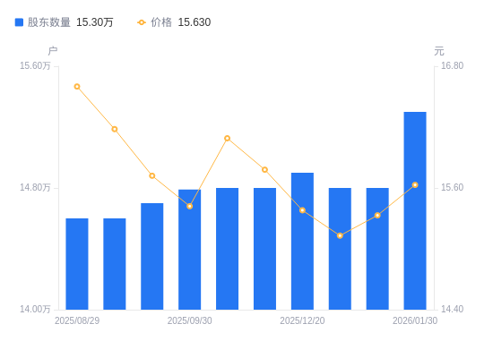 近一年(2025年2月28日至2026年1月30日),华兰生物A股股东户数从14.74万户,增加至15.3万户,增幅3.82%,区间股价上涨1.82%。