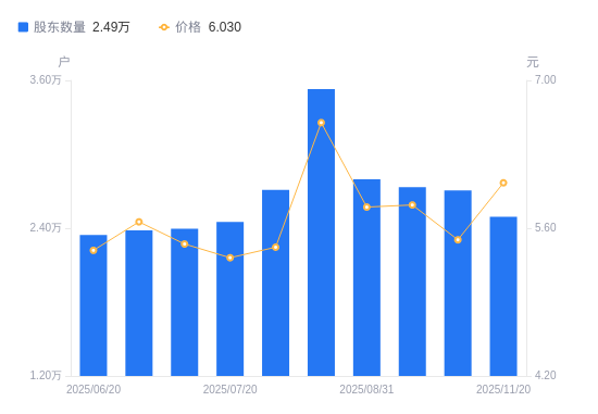 近一年(2024年11月20日至2025年11月20日),凯恩股份A股股东户数从2.6万户,减低至2.49万户,降幅4.24%,区间股价上涨11.54%。