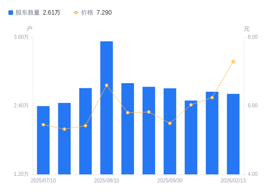 近一年(2025年2月28日至2026年2月13日),凯恩股份A股股东户数从2.51万户,增加至2.61万户,增幅3.90%,区间股价上涨55.57%。