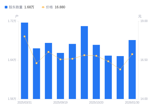 近一年(2025年3月31日至2026年1月30日),旺能环境A股股东户数从1.72万户,减低至1.68万户,降幅2.09%,区间股价下跌6.43%。