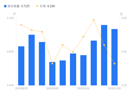 近一年(2024年11月29日至2025年11月28日),华帝股份A股股东户数从3.38万户,增加至3.71万户,增幅9.71%,区间股价下跌17.98%。