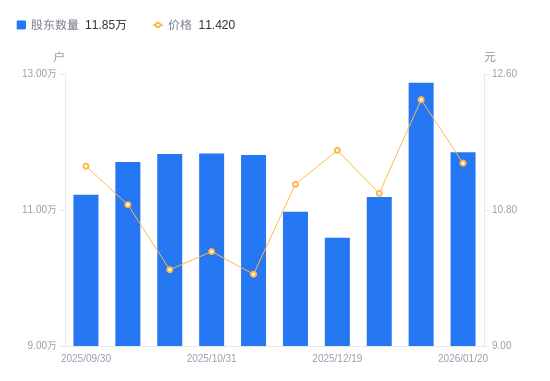 近一年(2025年1月20日至2026年1月20日),联创电子A股股东户数从10.77万户,增加至11.85万户,增幅10.06%,区间股价上涨22.93%。