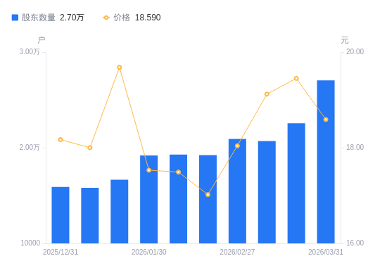 近一年(2025年3月31日至2026年3月31日),黔源电力A股股东户数从2.1万户,增加至2.7万户,增幅28.52%,区间股价上涨16.62%。