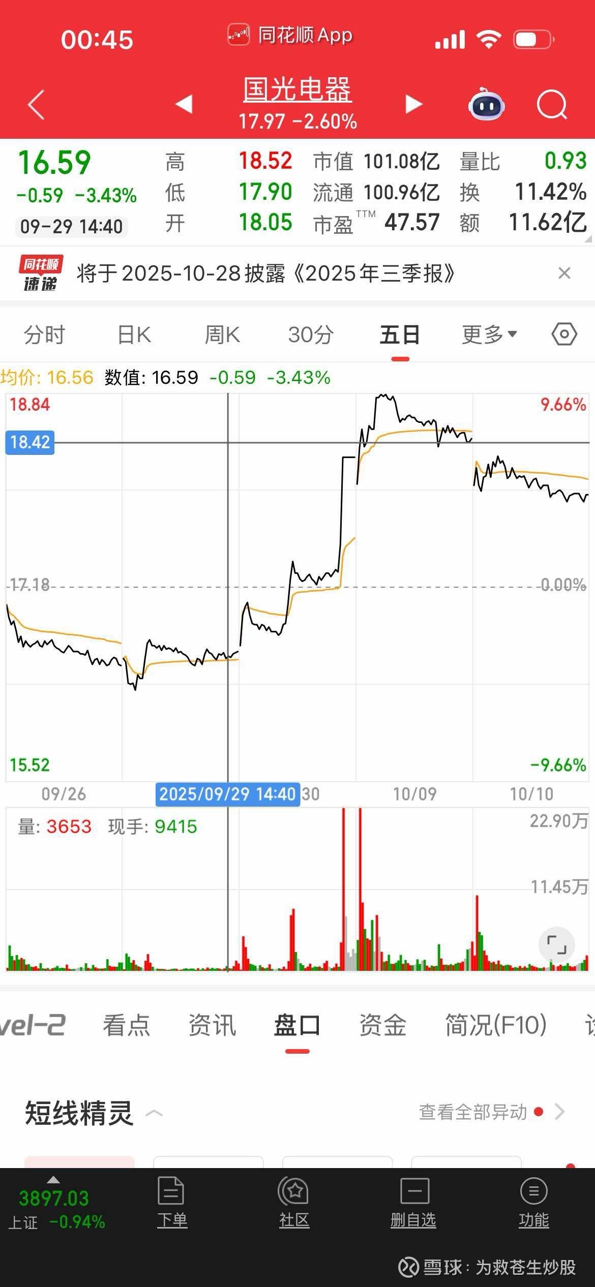 虽然从不喜欢预测股价,不过吹牛逼猜一个下周一国光电器的强势漂亮走法,2025年10月13日国光电器开盘价18.42左右,开盘直接上拉,至于能不能涨停我不知道,我不是主力。