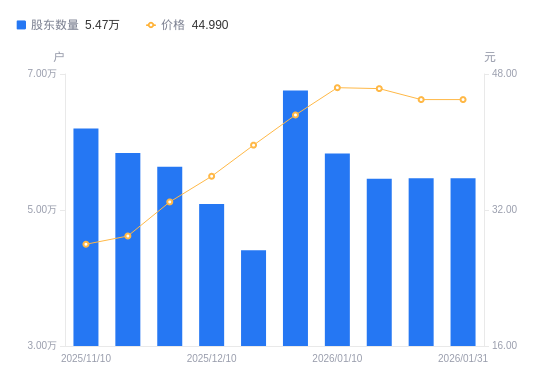 近一年(2025年1月31日至2026年1月31日),国机精工A股股东户数从4.44万户,增加至5.47万户,增幅23.09%,区间股价上涨250.12%。