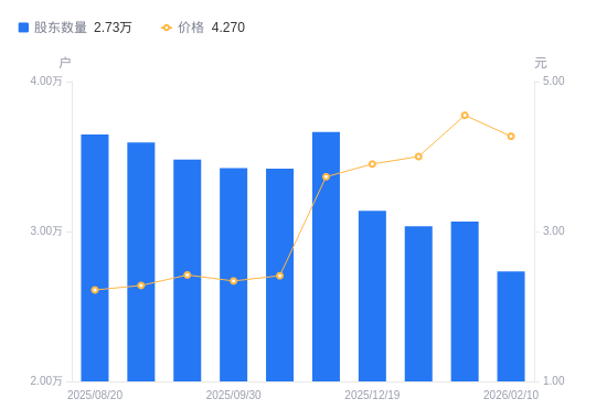 近一年(2025年2月28日至2026年2月10日),*ST宝鹰A股股东户数从4.9万户,减低至2.73万户,降幅44.24%,区间股价上涨58.15%。