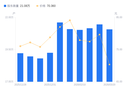 3月23日消息,数据显示,截至2026年3月20日,紫光国微A股股东总户数为21.08万户,较上期(2026年2月27日)减少3878户,降幅1.81%。公司最新A股总股本为8.5亿股,其中流通A股8.49亿股,户均持有流通A股数量为4030.37股,较上期增加72.82股,增幅1.84%;户均持流通A股市值28.36万元,较上期减少3.18万元,降幅10.09%。