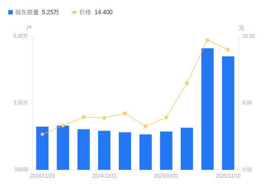 近一年(2024年11月10日至2025年11月10日),同洲电子A股股东户数从2.68万户,增加至5.25万户,增幅96.20%,区间股价上涨278.95%。