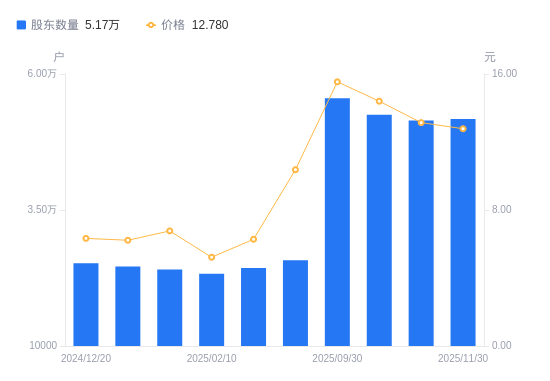 近一年(2024年12月20日至2025年11月30日),同洲电子A股股东户数从2.52万户,增加至5.17万户,增幅105.13%,区间股价上涨108.82%。