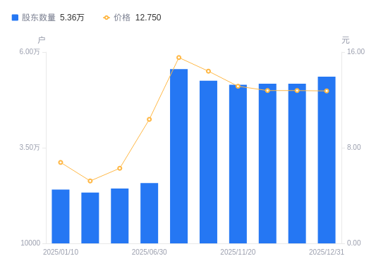 近一年(2024年12月31日至2025年12月31日),同洲电子A股股东户数从2.46万户,增加至5.36万户,增幅117.76%,区间股价上涨100.47%。