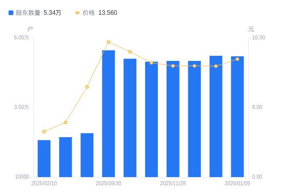 1月14日消息,数据显示,截至2026年1月9日,同洲电子A股股东总户数为5.34万户,较上期(2025年12月31日)减少219户,降幅0.41%。公司最新A股总股本为7.52亿股,其中流通A股6.89亿股,户均持有流通A股数量为1.29万股,较上期增加52.8股,增幅0.41%;户均持流通A股市值17.52万元,较上期增加1.11万元,增幅6.79%。