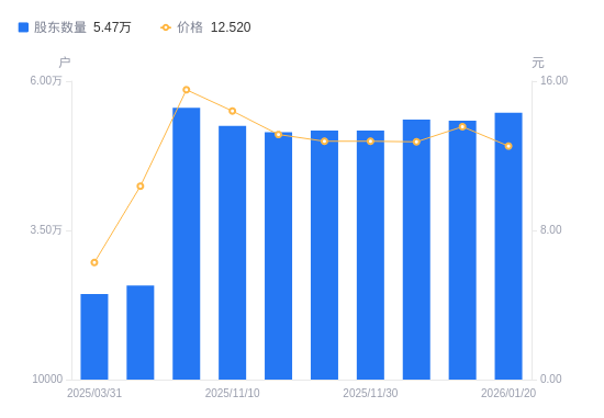 近一年(2025年2月10日至2026年1月20日),同洲电子A股股东户数从2.33万户,增加至5.47万户,增幅134.94%,区间股价上涨128.05%。