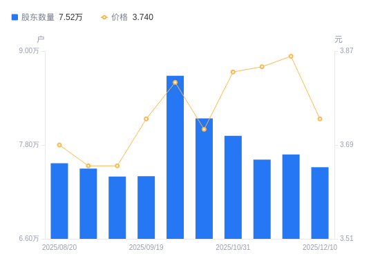 12月18日消息,数据显示,截至2025年12月10日,广东建工A股股东总户数为7.52万户,较上期(2025年11月28日)减少1635户,降幅2.13%。公司最新A股总股本为37.54亿股,其中流通A股15.63亿股,户均持有流通A股数量为2.08万股,较上期增加442.8股,增幅2.18%;户均持流通A股市值7.78万元,较上期减少786.27元,降幅1.00%。