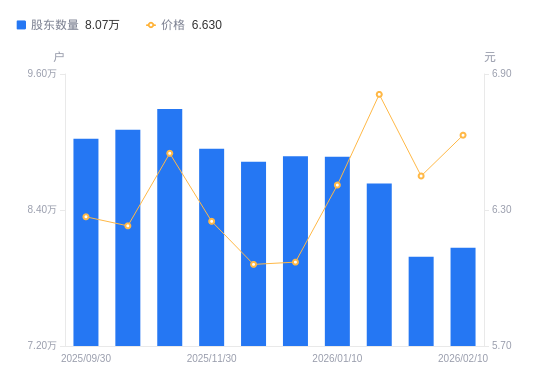 2月13日消息,数据显示,截至2026年2月10日,远光软件A股股东总户数为8.07万户,较上期(2026年1月31日)增加788户,增幅0.99%。公司最新A股总股本为19.1亿股,其中流通A股17.64亿股,户均持有流通A股数量为2.19万股,较上期减少215.67股,降幅0.98%;户均持流通A股市值14.5万元,较上期增加2544.33元,增幅1.79%。