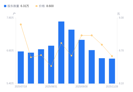 近一年(2024年12月10日至2025年11月28日),软控股份A股股东户数从5.9万户,增加至6.31万户,增幅6.91%,区间股价上涨3.12%。