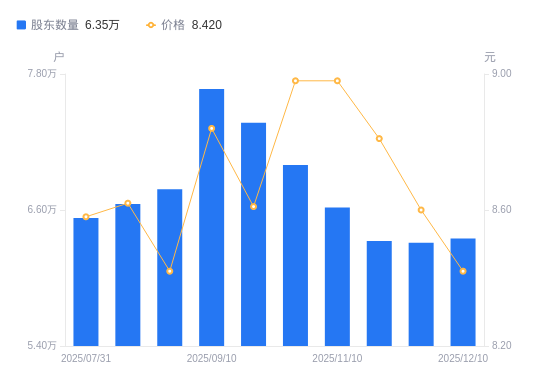 近一年(2024年12月10日至2025年12月10日),软控股份A股股东户数从5.9万户,增加至6.35万户,增幅7.53%,区间股价上涨0.96%。