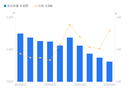 1月15日消息,数据显示,截至2026年1月9日,*ST星光A股股东总户数为4.1万户,较上期(2025年12月31日)减少1000户,降幅2.38%。公司最新A股总股本为11.09亿股,其中流通A股10.42亿股,户均持有流通A股数量为2.54万股,较上期增加605.27股,增幅2.44%;户均持流通A股市值5.69万元,较上期增加7063.5元,增幅14.16%。