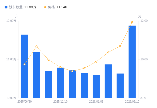 2月13日消息,数据显示,截至2026年2月10日,苏州固锝A股股东总户数为11.88万户,较上期(2026年1月30日)增加1.24万户,增幅11.67%。公司最新A股总股本为8.11亿股,其中流通A股8.1亿股,户均持有流通A股数量为6817.71股,较上期减少795.94股,降幅10.45%;户均持流通A股市值8.14万元,较上期减少62.58元,降幅0.08%。