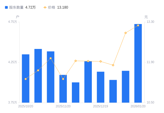 近一年(2025年1月20日至2026年1月20日),金智科技A股股东户数从4.59万户,增加至4.72万户,增幅3.02%,区间股价上涨50.89%。
