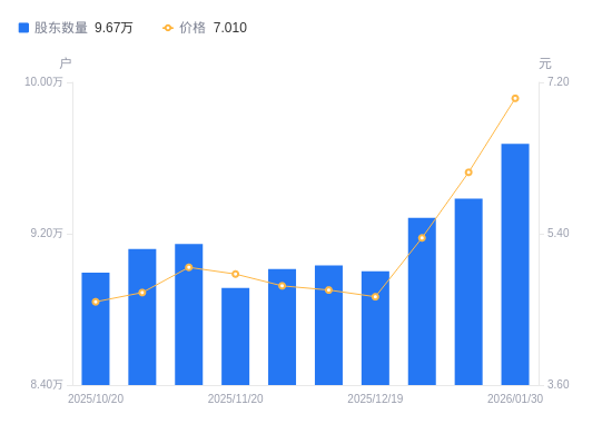 近一年(2025年2月10日至2026年1月30日),中泰化学A股股东户数从8.55万户,增加至9.67万户,增幅13.11%,区间股价上涨54.41%。