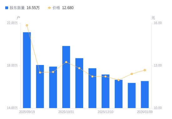 1月14日消息,数据显示,截至2026年1月9日,山河智能A股股东总户数为16.55万户,较上期(2025年12月31日)增加1799户,增幅1.10%。公司最新A股总股本为10.75亿股,其中流通A股10.73亿股,户均持有流通A股数量为6483.09股,较上期减少71.26股,降幅1.09%;户均持流通A股市值8.22万元,较上期增加866.06元,增幅1.06%。