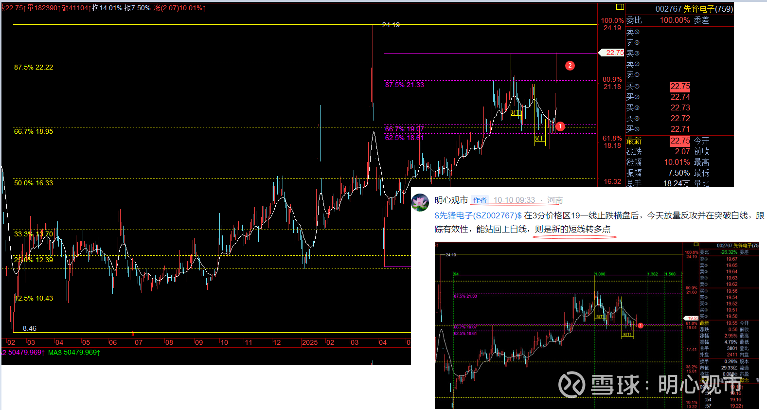 先锋电子,还是熟悉的老朋友,一动就好加速的主~这里看一张周图:趋势,红白两条多空线对应13.3-13.18上看多,价格叠加百分比显示,53.75下跌的875位对应14,近循环的半分对应14.56,14-14.56构成当前价格关键区;能突破站到14.56上方,则波段有去19.25-19.68的预期。当前支撑14,短压14.56,突破...