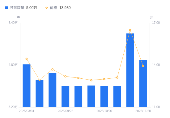 11月26日消息,数据显示,截至2025年11月20日,三变科技A股股东总户数为5万户,较上期(2025年11月10日)减少1万户,降幅16.67%。公司最新A股总股本为2.94亿股,其中流通A股2.62亿股,户均持有流通A股数量为5241.59股,较上期增加873.6股,增幅20.00%;户均持流通A股市值7.3万元,较上期增加987.17元,增幅1.37%。