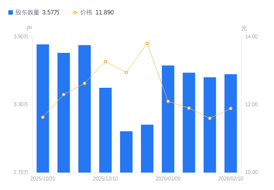 2月12日消息,数据显示,截至2026年2月10日,东港股份A股股东总户数为3.57万户,较上期(2026年1月30日)增加279户,增幅0.79%。公司最新A股总股本为5.24亿股,其中流通A股5.24亿股,户均持有流通A股数量为1.47万股,较上期减少115.51股,降幅0.78%;户均持流通A股市值17.44万元,较上期增加2912.95元,增幅1.70%。