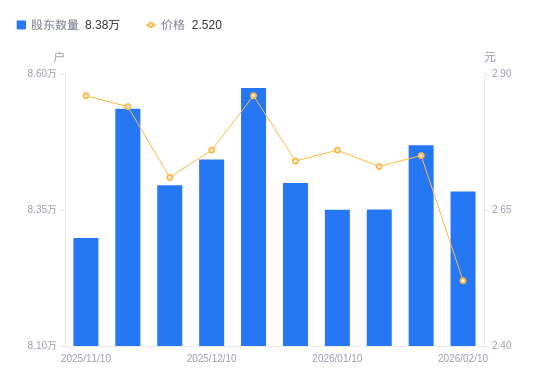 近一年(2025年2月10日至2026年2月10日),天邦食品A股股东户数从7.53万户,增加至8.38万户,增幅11.32%,区间股价下跌15.44%。