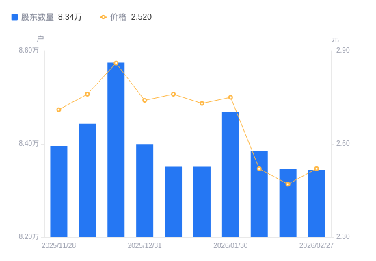 近一年(2025年2月28日至2026年2月27日),天邦食品A股股东户数从7.48万户,增加至8.34万户,增幅11.49%,区间股价下跌7.01%。