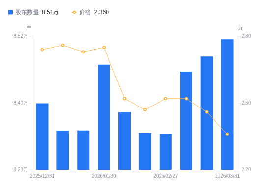 近一年(2025年3月31日至2026年3月31日),天邦食品A股股东户数从7.78万户,增加至8.51万户,增幅9.41%,区间股价下跌22.62%。