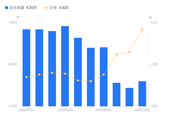 近一年(2024年11月20日至2025年11月10日),东南网架A股股东户数从5.18万户,减低至4.55万户,降幅12.16%,区间股价上涨7.66%。