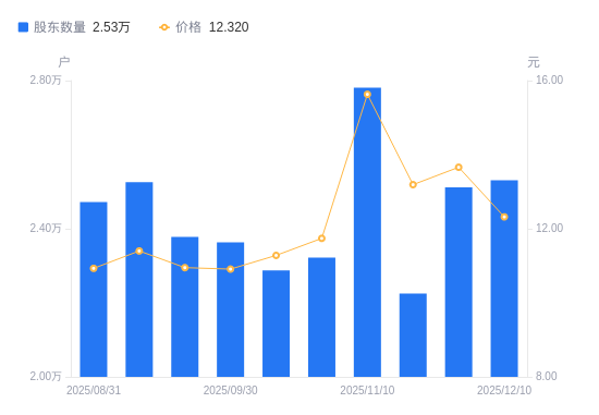 近一年(2024年12月31日至2025年12月10日),安纳达A股股东户数从2.21万户,增加至2.53万户,增幅14.39%,区间股价上涨23.69%。