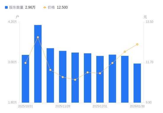 2月2日消息,数据显示,截至2026年1月30日,东华科技A股股东总户数为2.96万户,较上期(2026年1月20日)减少2300户,降幅7.20%。公司最新A股总股本为7.08亿股,其中流通A股7.07亿股,户均持有流通A股数量为2.39万股,较上期增加1718.67股,增幅7.76%;户均持流通A股市值29.82万元,较上期增加2.88万元,增幅10.68%。