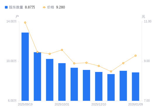 近一年(2025年1月10日至2026年1月9日),北纬科技A股股东户数从5.5万户,增加至8.87万户,增幅61.27%,区间股价上涨49.58%。