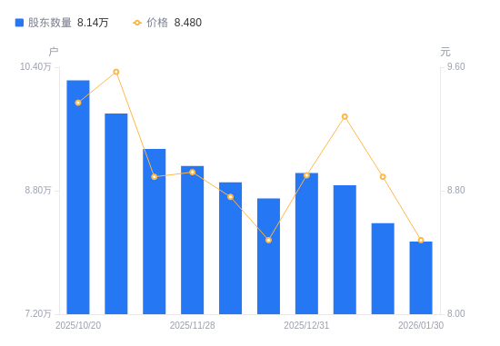 2月2日消息,数据显示,截至2026年1月30日,北纬科技A股股东总户数为8.14万户,较上期(2026年1月20日)减少2400户,降幅2.86%。公司最新A股总股本为5.59亿股,其中流通A股4.49亿股,户均持有流通A股数量为5519.87股,较上期增加158.09股,增幅2.95%;户均持流通A股市值4.68万元,较上期减少857.75元,降幅1.80%。