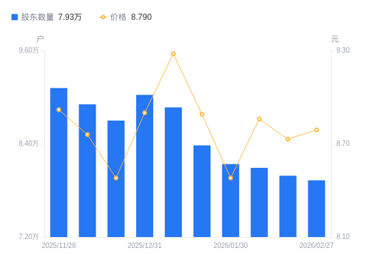 近一年(2025年2月28日至2026年2月27日),北纬科技A股股东户数从6.41万户,增加至7.93万户,增幅23.70%,区间股价上涨8.87%。