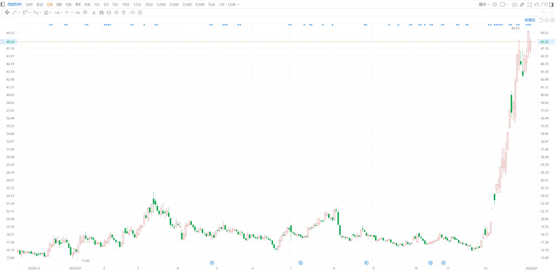 西部材料(002149.SZ)今日早盘一度跌6.99%至46.31元;该股昨日收涨8.17%并于盘中高见49.79元创历史新高,2025年全年累涨超1.6倍。西部材料昨日晚间公告称,公司股东西安航天科技工业有限公司于2026年1月5日通过集中竞价交易方式减持公司股份合计479.91万股,占公司总股本的0.9830%。据悉,截至三季度末,西安航天位列西部材料第二大股东。(格隆汇)