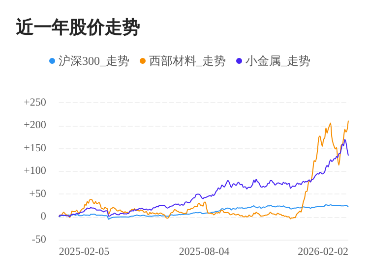 02月02日,西部材料(002149)股价大涨。截至今日收盘,西部材料上涨6.64%,收盘价为52.50元,收盘价创历史新高。