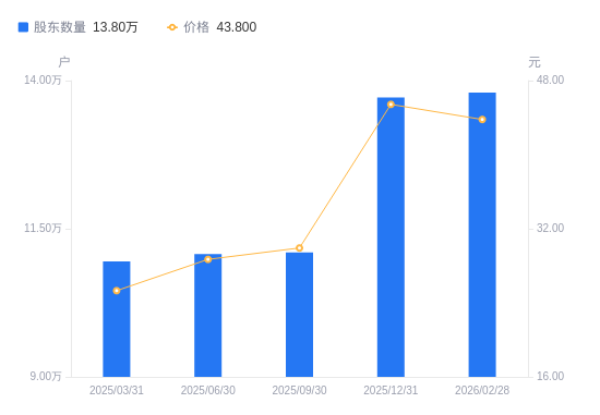 近一年(2025年2月28日至2026年2月28日),北斗星通A股股东户数从11.03万户,增加至13.8万户,增幅25.12%,区间股价上涨63.07%。