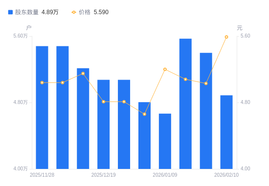 近一年(2025年2月10日至2026年2月10日),悦心健康A股股东户数从5.62万户,减低至4.89万户,降幅13.02%,区间股价上涨58.36%。
