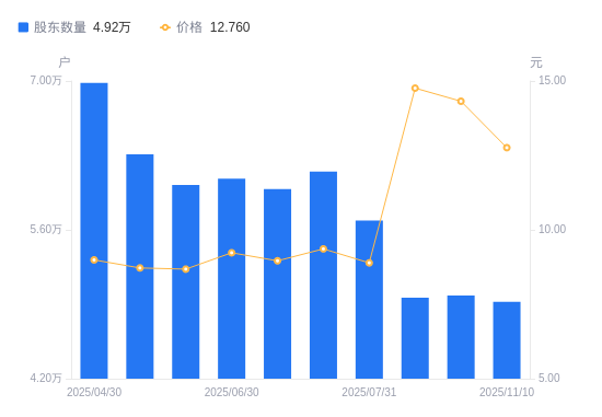 11月11日消息,数据显示,截至2025年11月10日,宁波东力A股股东总户数为4.92万户,较上期(2025年10月10日)减少595户,降幅1.19%。公司最新A股总股本为5.32亿股,其中流通A股4.8亿股,户均持有流通A股数量为9745.78股,较上期增加116.38股,增幅1.21%;户均持流通A股市值12.44万元,较上期减少1.35万元,降幅9.82%。