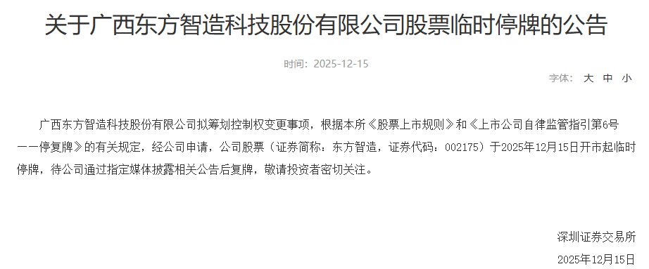 【大河财立方消息】12月15日,深交所发布公告称,广西东方智造(002175)科技股份有限公司(证券简称:东方智造,证券代码:002175)拟筹划控制权变更事项,根据有关规定,经公司申请,公司股票于2025年12月15日开市起临时停牌,待公司通过指定媒体披露相关公告后复牌。