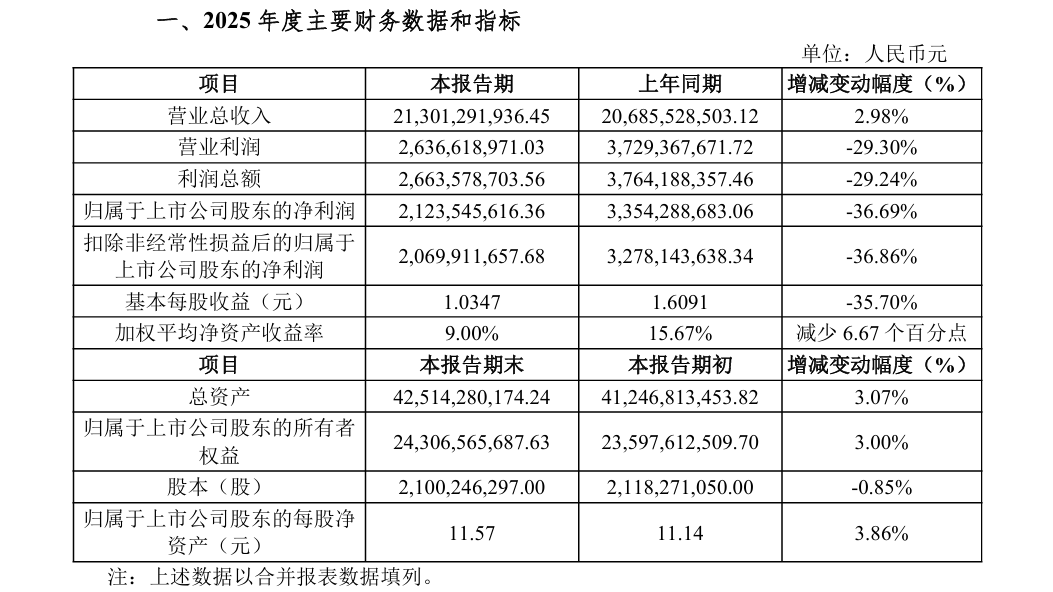 2月9日,中航光电(002179)(002179.SZ)披露2025年年度业绩快报,全年营业总收入213.01亿元,同比增长2.98%;归属于上市公司股东的净利润21.24亿元,同比下降36.69%;基本每股收益1.0347元,同比下降35.70%。