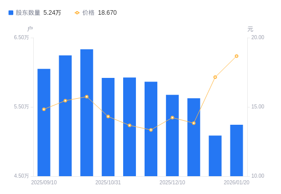 近一年(2025年1月20日至2026年1月20日),宝武镁业A股股东户数从6.09万户,减低至5.24万户,降幅13.89%,区间股价上涨61.23%。