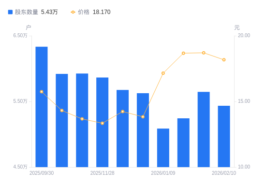 近一年(2025年2月10日至2026年2月10日),宝武镁业A股股东户数从5.91万户,减低至5.43万户,降幅8.05%,区间股价上涨53.07%。